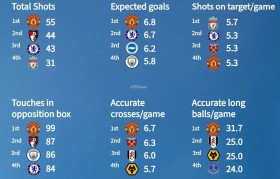英超前3轮统计:曼联多项进攻数据排名第1 三轮英超比赛后的数据统计:曼联在射门次数,预期进球数,对...