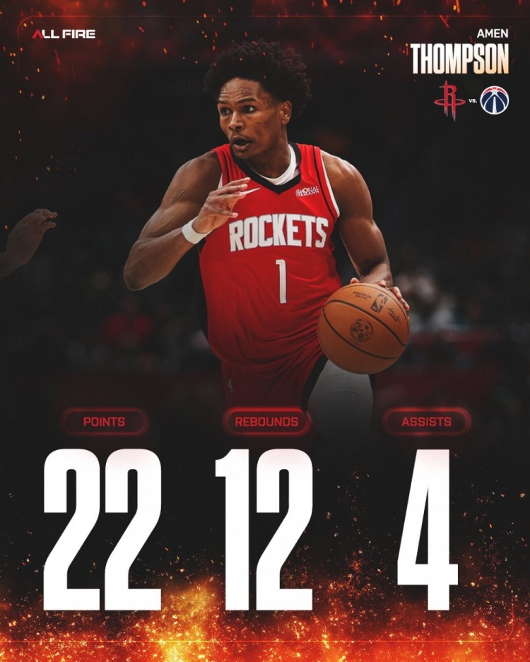 赛后,火箭官推发布四名球员数据海报,分别是: