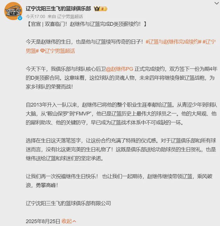 赵继伟,30岁,获得辽宁队提供的4年D类续约合同。