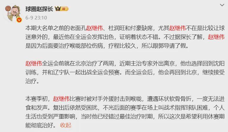 今年夏天,赵继伟没有入选中国男篮集训大名单从而无缘出战亚洲杯,他是因为要治疗喉咙部位伤病,特意跟郭士强请假。2025年亚洲杯,中国男篮时隔十年杀进决赛,并且决赛中1分惜败澳大利亚拿到亚军。