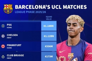 体育资讯8月29日讯 本赛季欧冠联赛阶段对阵抽签结果出炉,德国转会市场盘点了巴萨对手的身价。