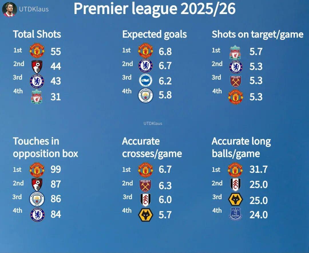 曼联在射门次数,预期进球数,对手禁区内触球次数,每场比赛的成功传中次数和成功长传球次数都排在第1位;每场比赛的射门中目标次数并列第2。